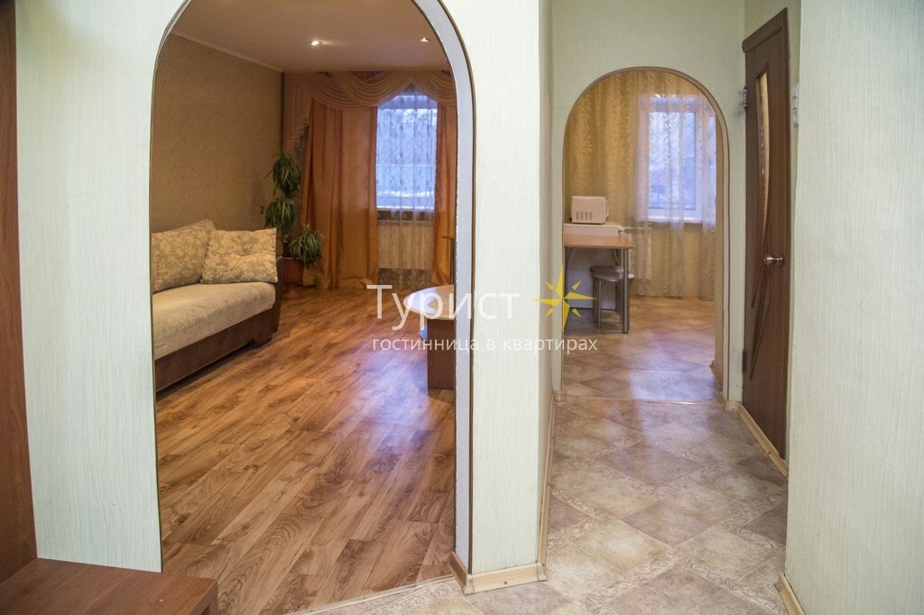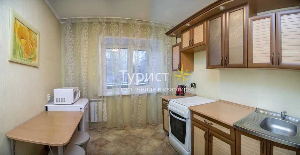 Интерьер апартаментов выполнен просто и со вкусом – преобладающая гамма пастельных тонов, элементы древесины и полукруглые арки создают атмосферу уюта, домашнего очага и непринужденности. В основной комнате в наличии светлый удобный диван, который также служит спальным местом, кофейный столик, тумба с жидкокристаллическим телевизором. Кухонный гарнитур насчитывает и бытовые электроприборы, как микроволновка и холодильник, а также все столовые принадлежности для приготовления пищи и самой трапезы. Санузел раздельный, оснащен новой сантехникой и многофункциональной стиральной машиной.